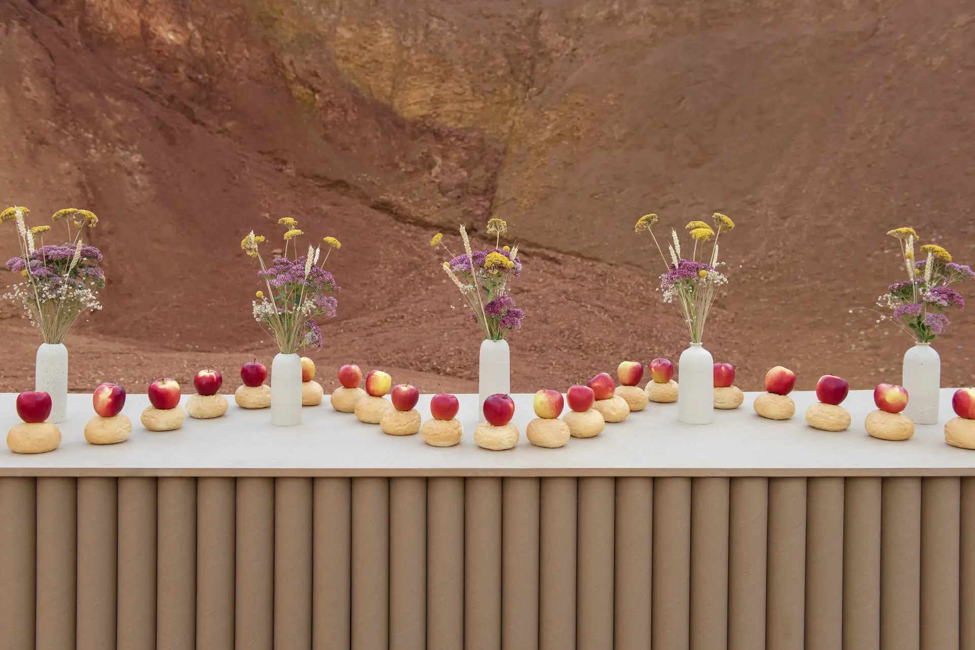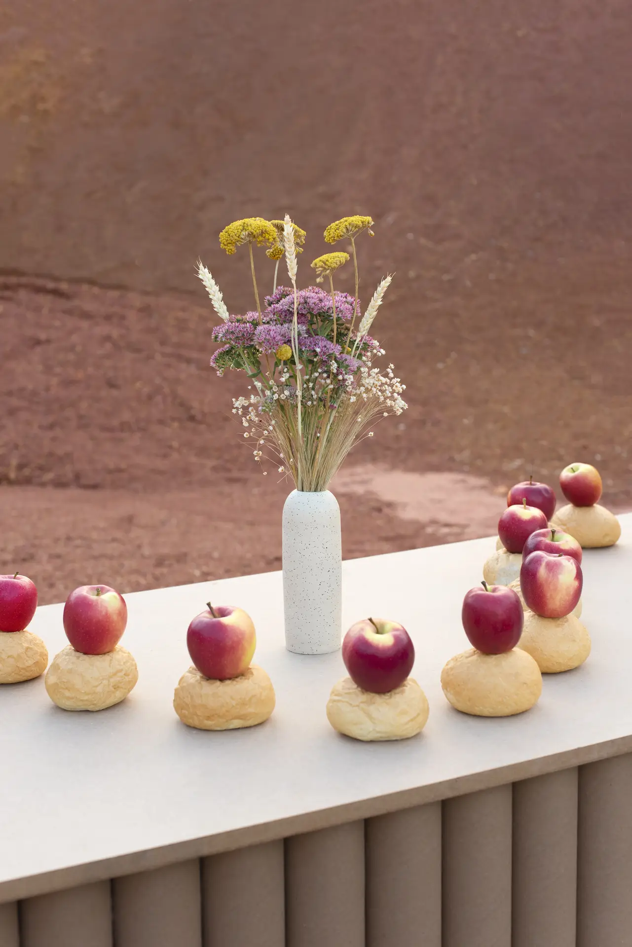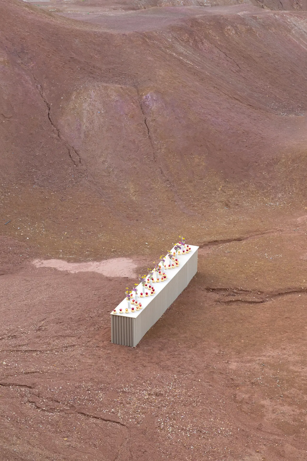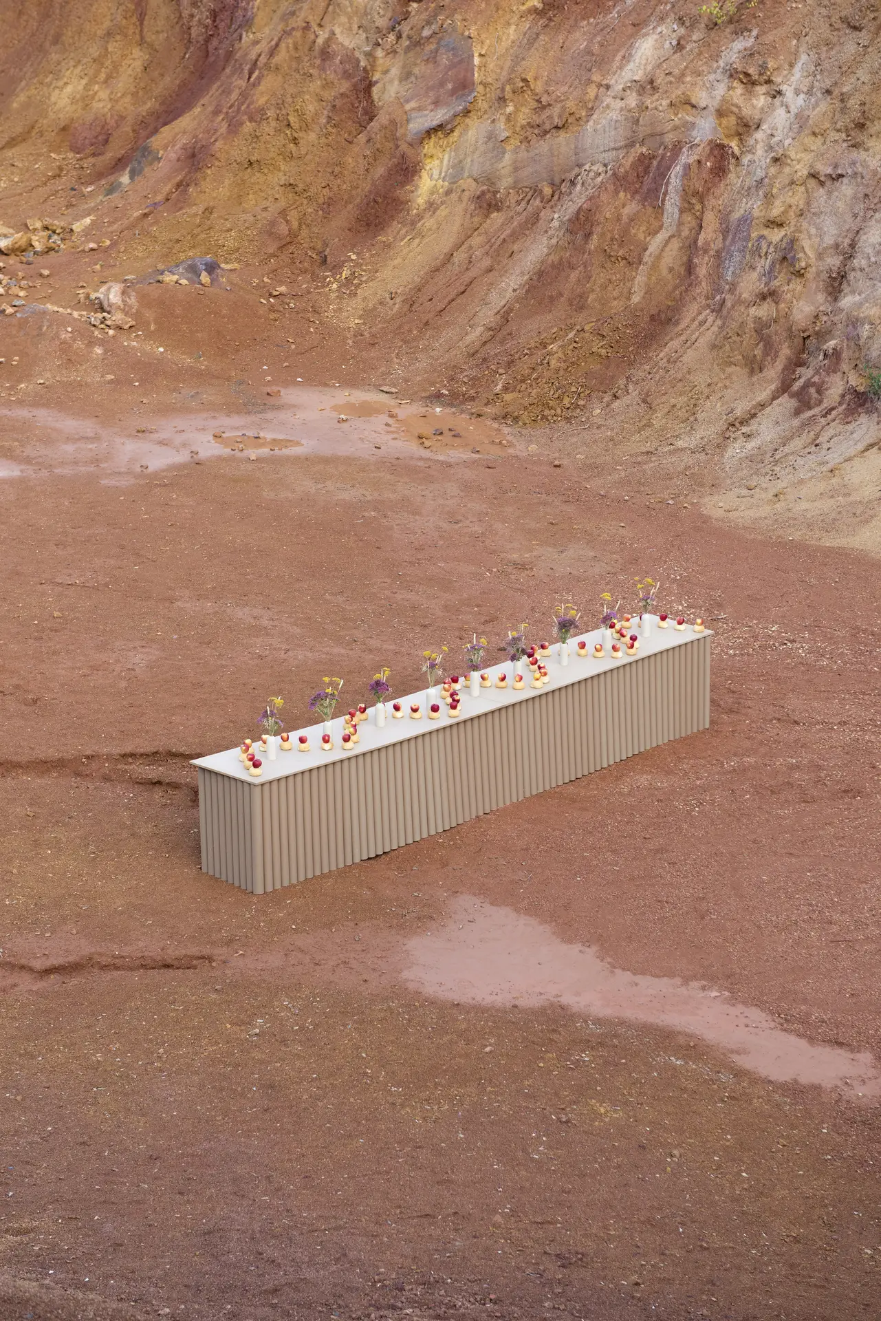 DescriptionThe table was constructed from recycled printing materials, reflecting a commitment to sustainability. Its structure consists of 146 paper rolls fixed together, topped with a 6-meter-long raw MDF tabletop. Initially designed as a supporting object for exhibitions, it gained a new layer of meaning through the photography of Matti Varga. As part of a collaboration, the installation was presented in the Gánt Bauxite Mine—an environment vastly different from its original context. Despite being a foreign object, the table did not feel out of place. Instead, it seamlessly blended into the surroundings, becoming an organic part of the landscape. Creative freedom, and cultural experimentation.