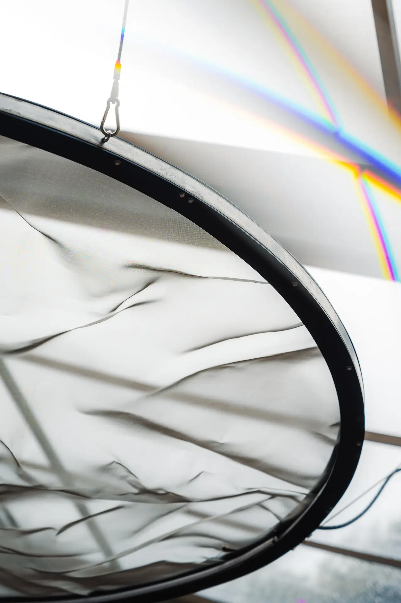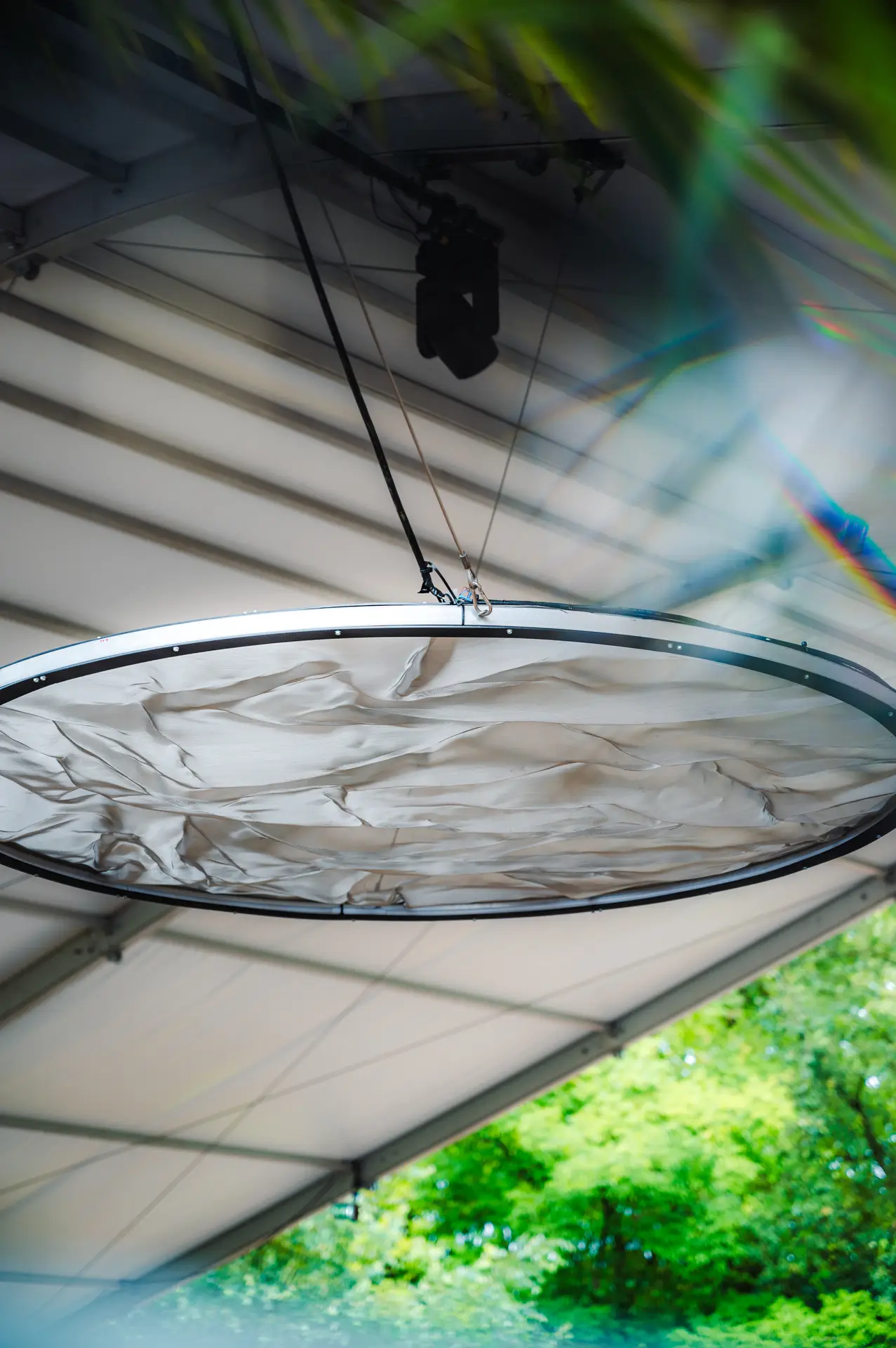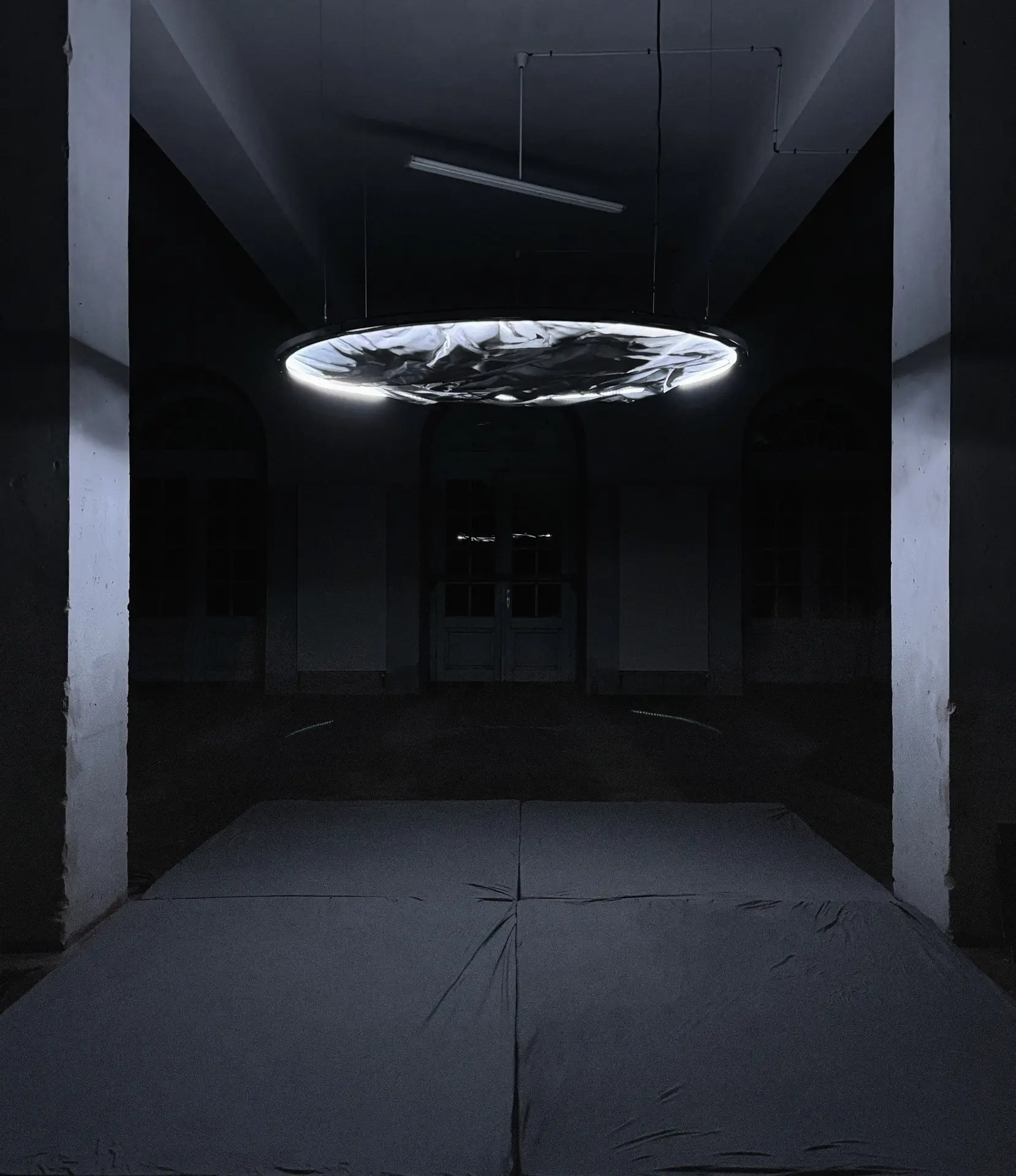 The installation combines the essence of metal and water, undergoing a visual transformation under the influence of natural and artificial light. During the day, the natural light creates gentle reflections and shadows on the metal mesh surface, while in the evening, artificial lighting evokes an almost mystical transformation. The installation draws inspiration from an earlier work, Radiance, using water as its main symbol. On the surface of the deformed metal mesh, a visual interplay between light and water unfolds, blurring the boundaries between reality and illusion.