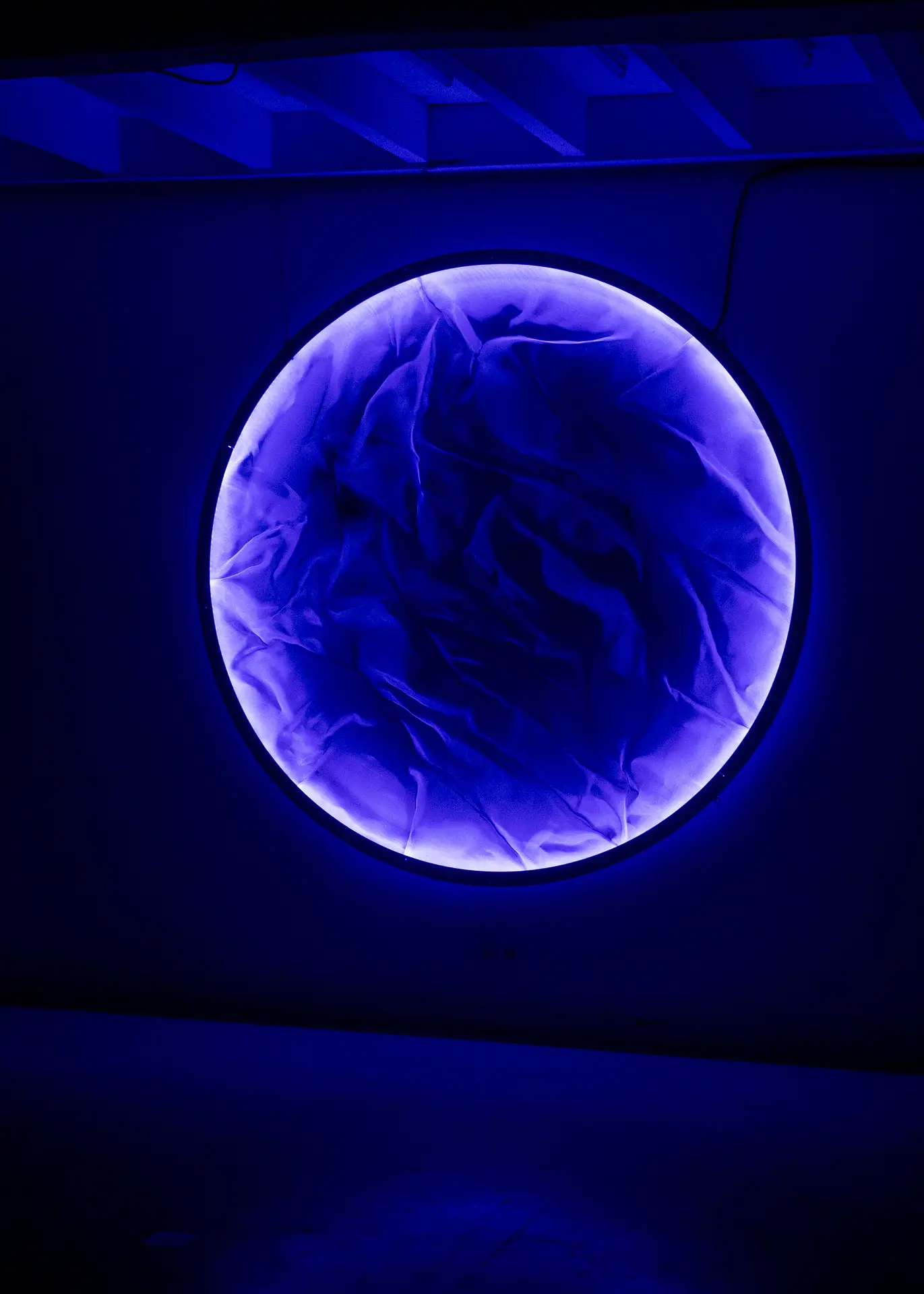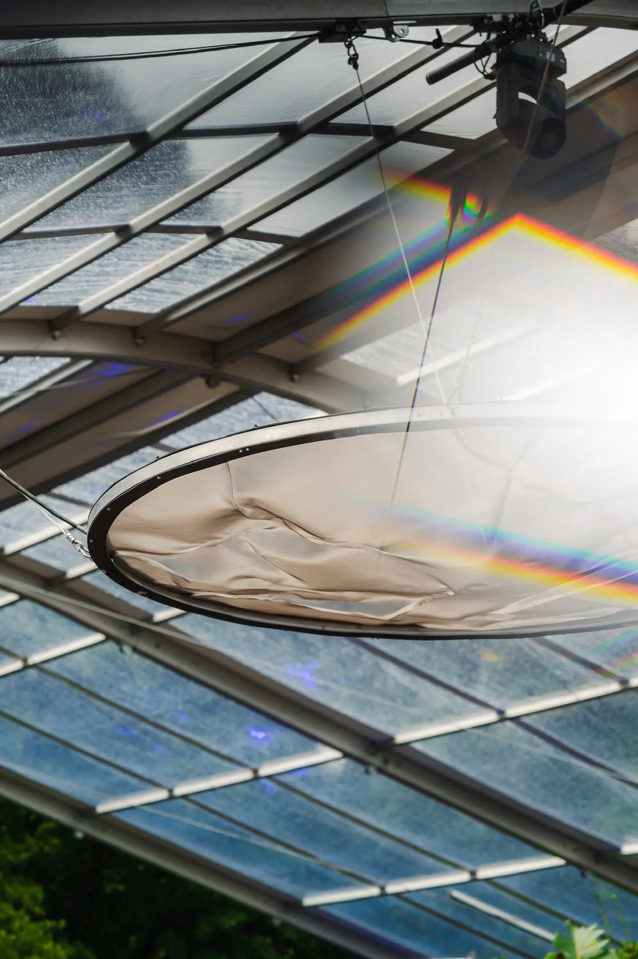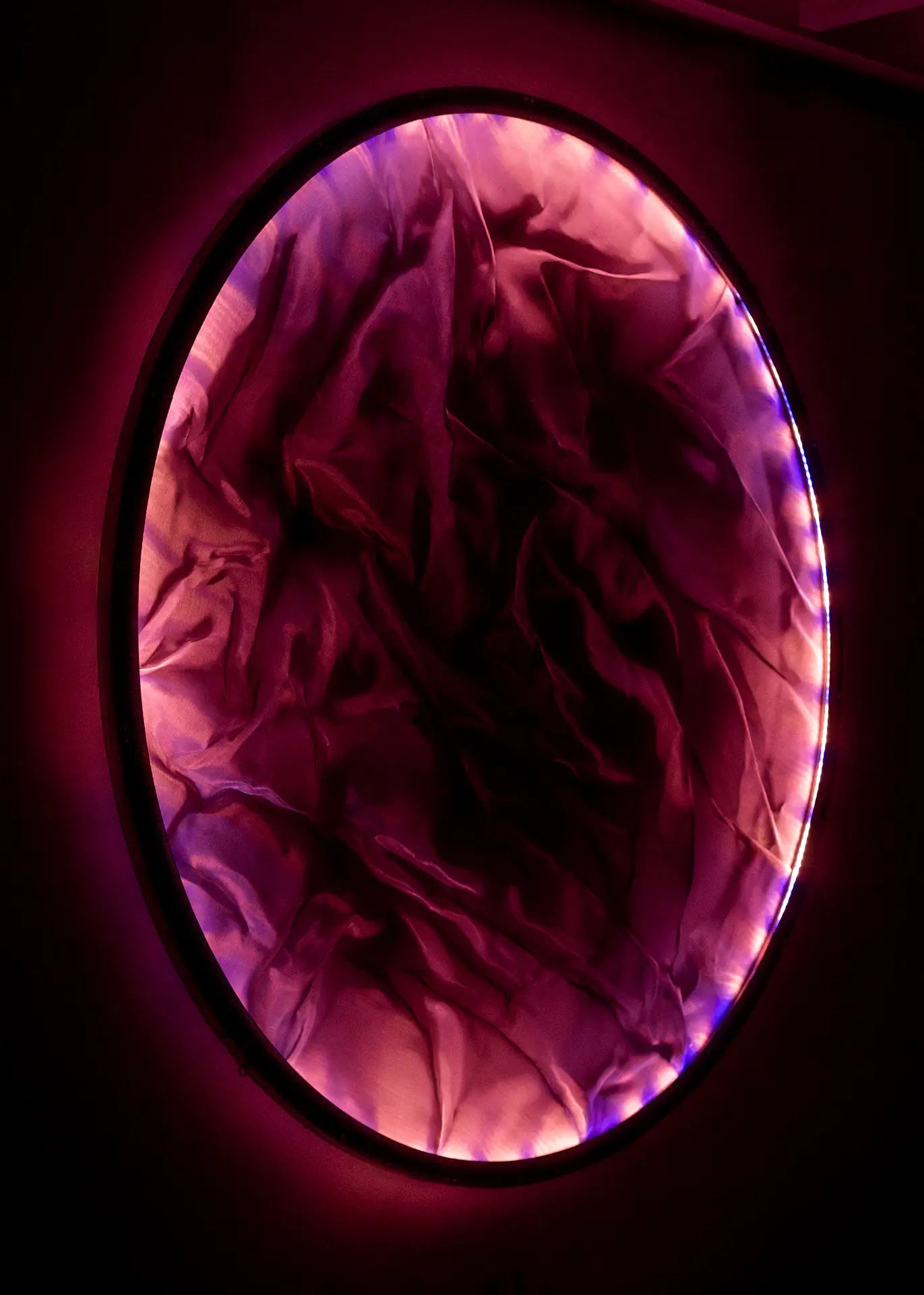 The installation combines the essence of metal and water, undergoing a visual transformation under the influence of natural and artificial light. During the day, the natural light creates gentle reflections and shadows on the metal mesh surface, while in the evening, artificial lighting evokes an almost mystical transformation. The installation draws inspiration from an earlier work, Radiance, using water as its main symbol. On the surface of the deformed metal mesh, a visual interplay between light and water unfolds, blurring the boundaries between reality and illusion.