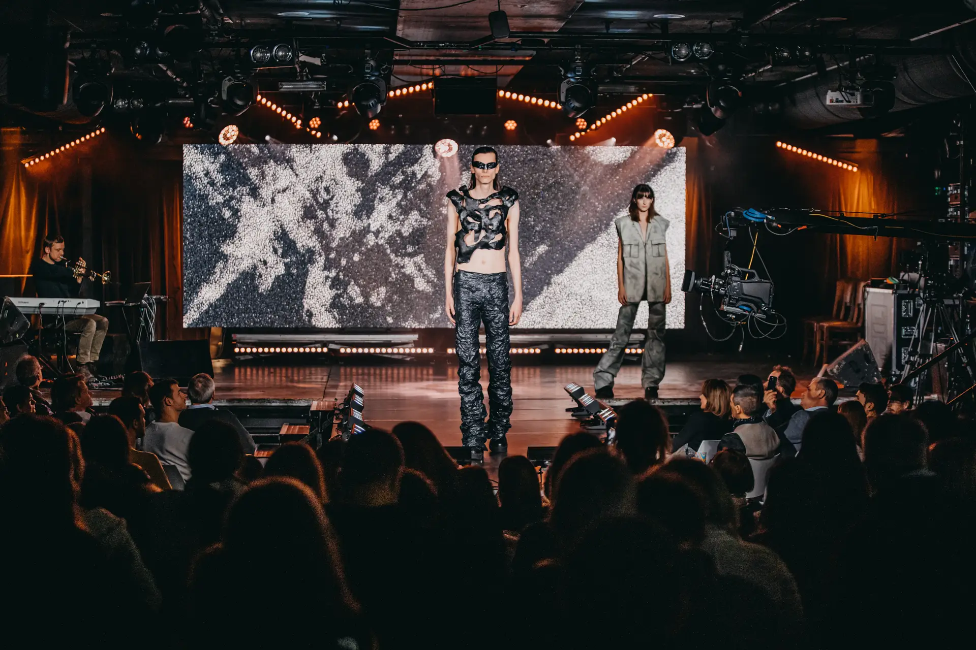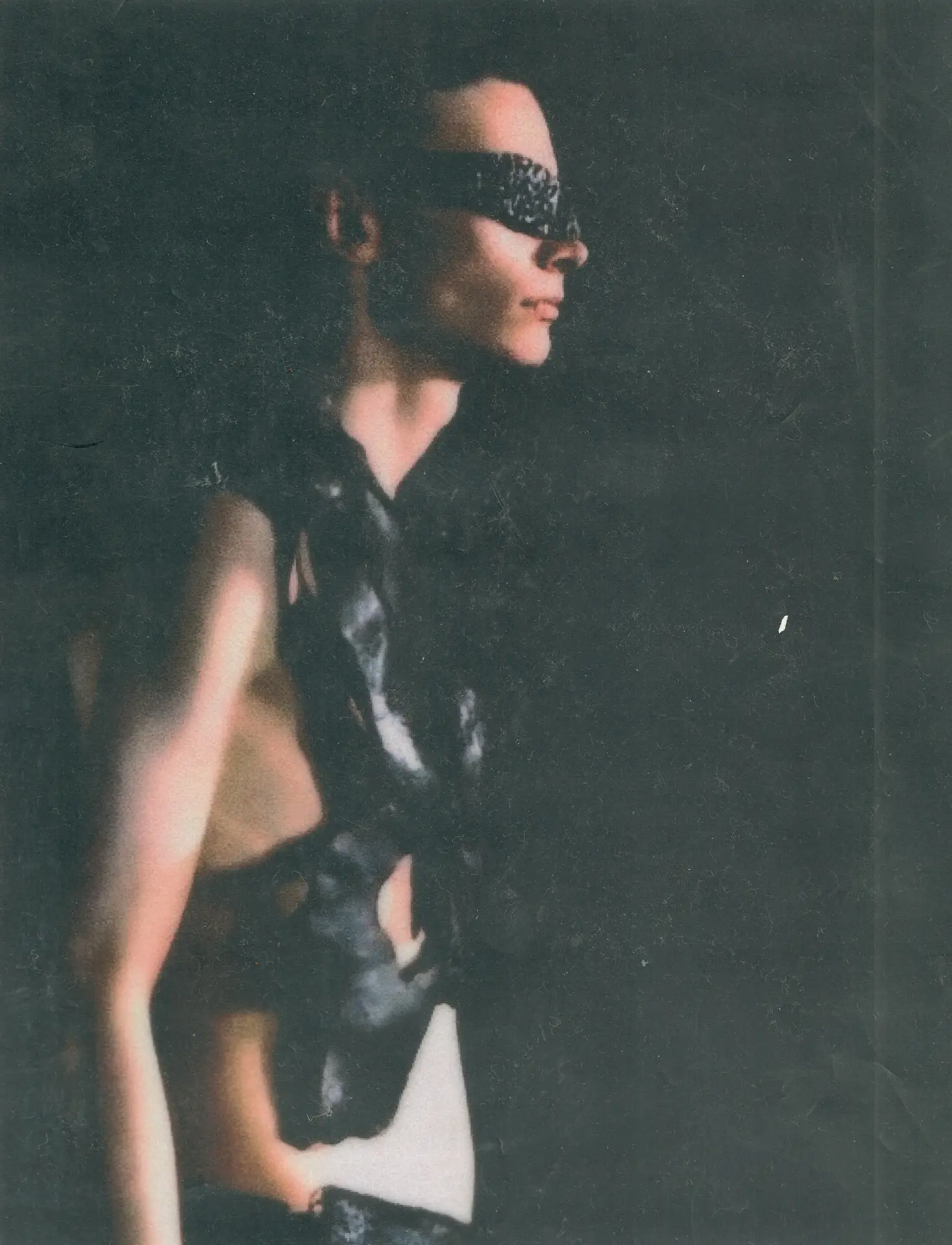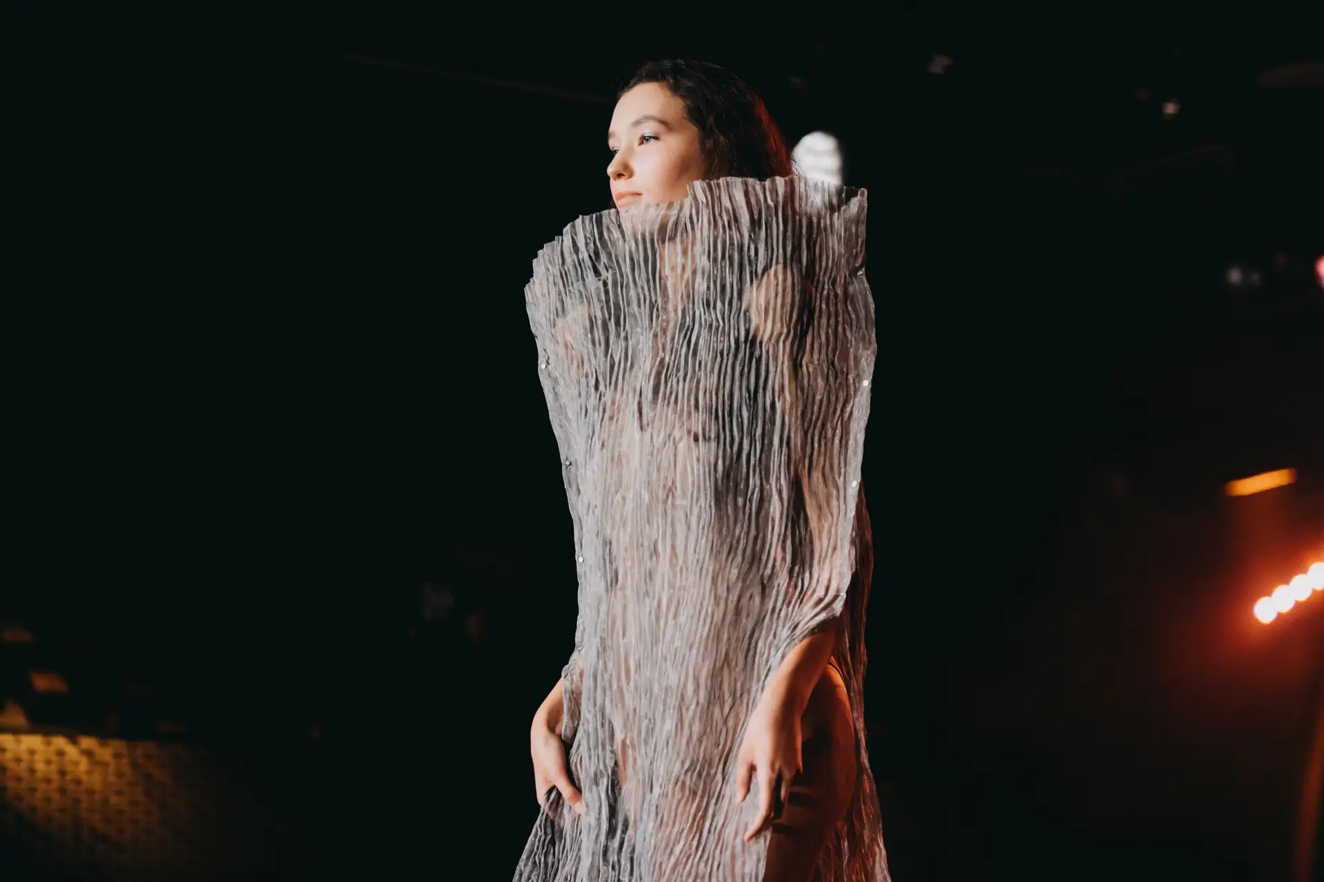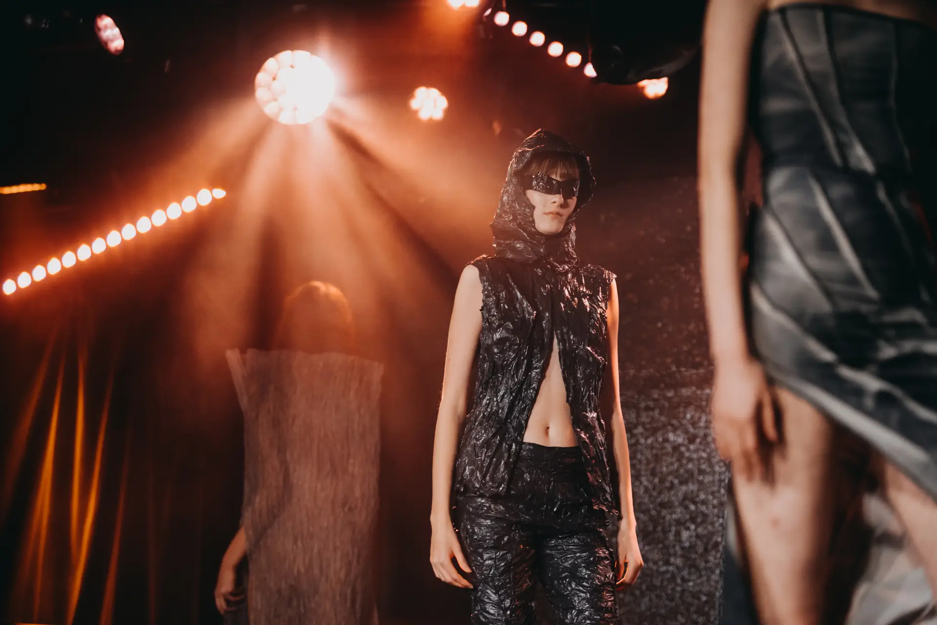 DescriptionMetamorphosis, material manipulation, and sensory restriction formed the conceptual foundation of the collaboration presented at A38. As part of the Music x Visuals event series, Kamilla Szemere’s latest collection was accompanied by a live performance from Lőrinc Barabás. Each piece reflected a journey of psychological transformation and growth—progressing from a closed state toward full emergence. Through our collaborative design, the collection was extended with a sculptural “metal mesh” piece and patinated black copper eye coverings. The fine mesh was crumpled into a cocoon-like shape that enveloped the body, while the copper elements restricted vision, narrowing spatial awareness and blurring perception to evoke heightened inward focus.