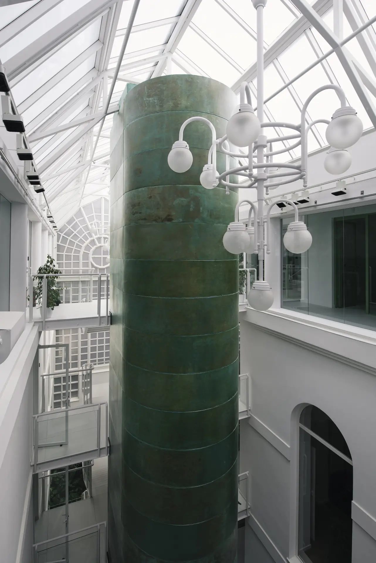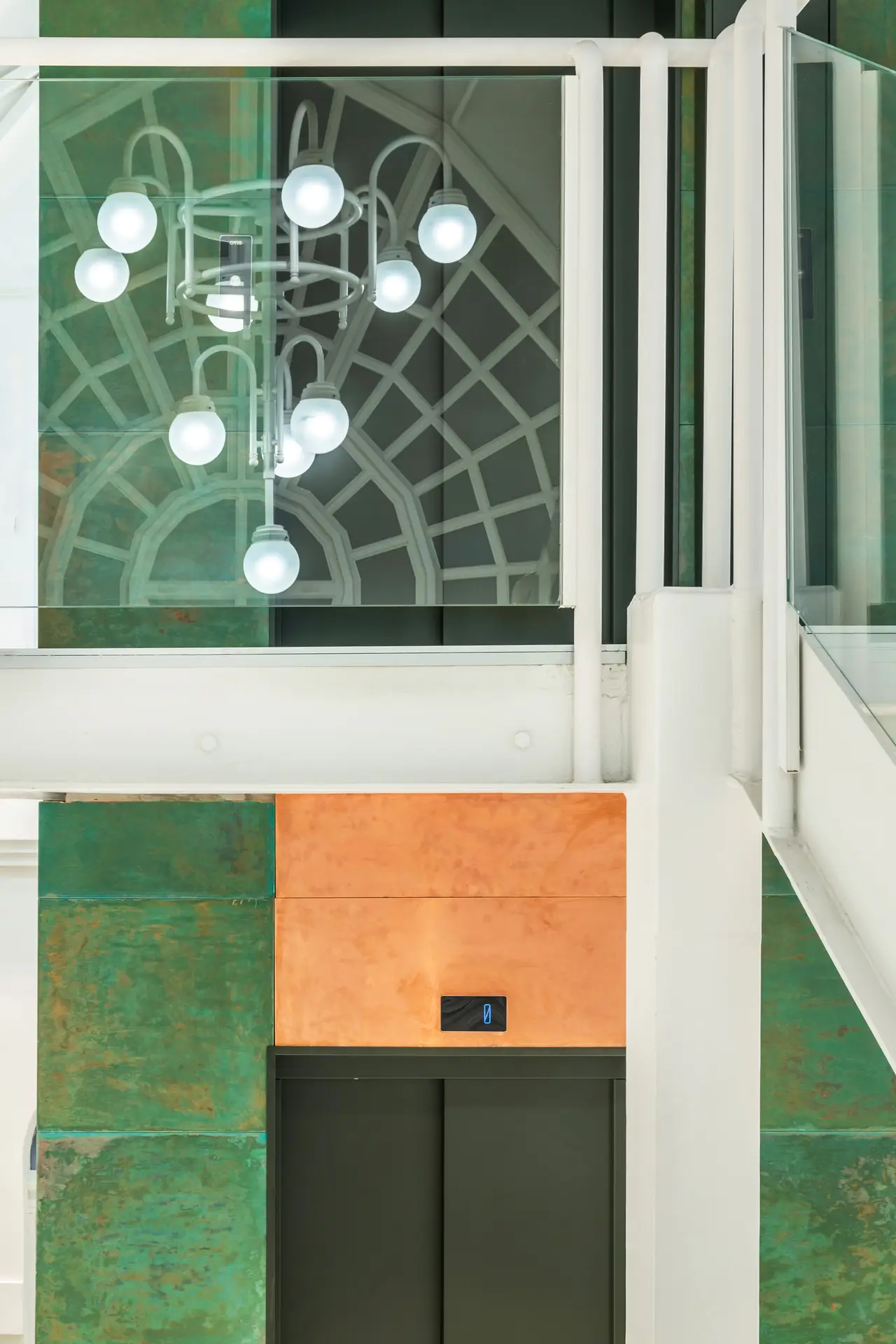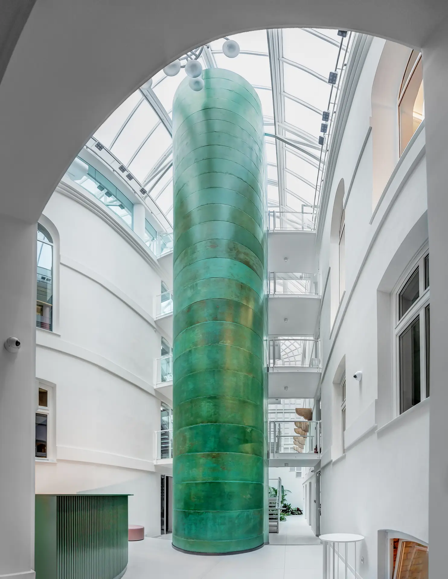 DescriptionAs part of a revitalization program, four palaces in central Budapest have been renovated. During the restoration of these partially heritage-listed buildings, the primary goal was to preserve as much of the original architectural structure as possible. At the same time, increasing the usable floor area was also an essential aspect, enabling the buildings to accommodate new functions. As part of the renovation process, a contemporary artist was invited to contribute to each building, creating a site-specific, significant artwork that reflects the character of the space. The patinated copper plates were created for the former Wagner Palace, where the central elevator was also renovated as part of its transformation into an office building. The elevator shaft is clad in 78 large copper plates, each hand-patinated to a green finish. Standing 15 meters tall, the elevator features a total surface area of over 100 square meters. Although the same process was used for each plate, every finish is unique, resulting in a delicately varied, organic surface.