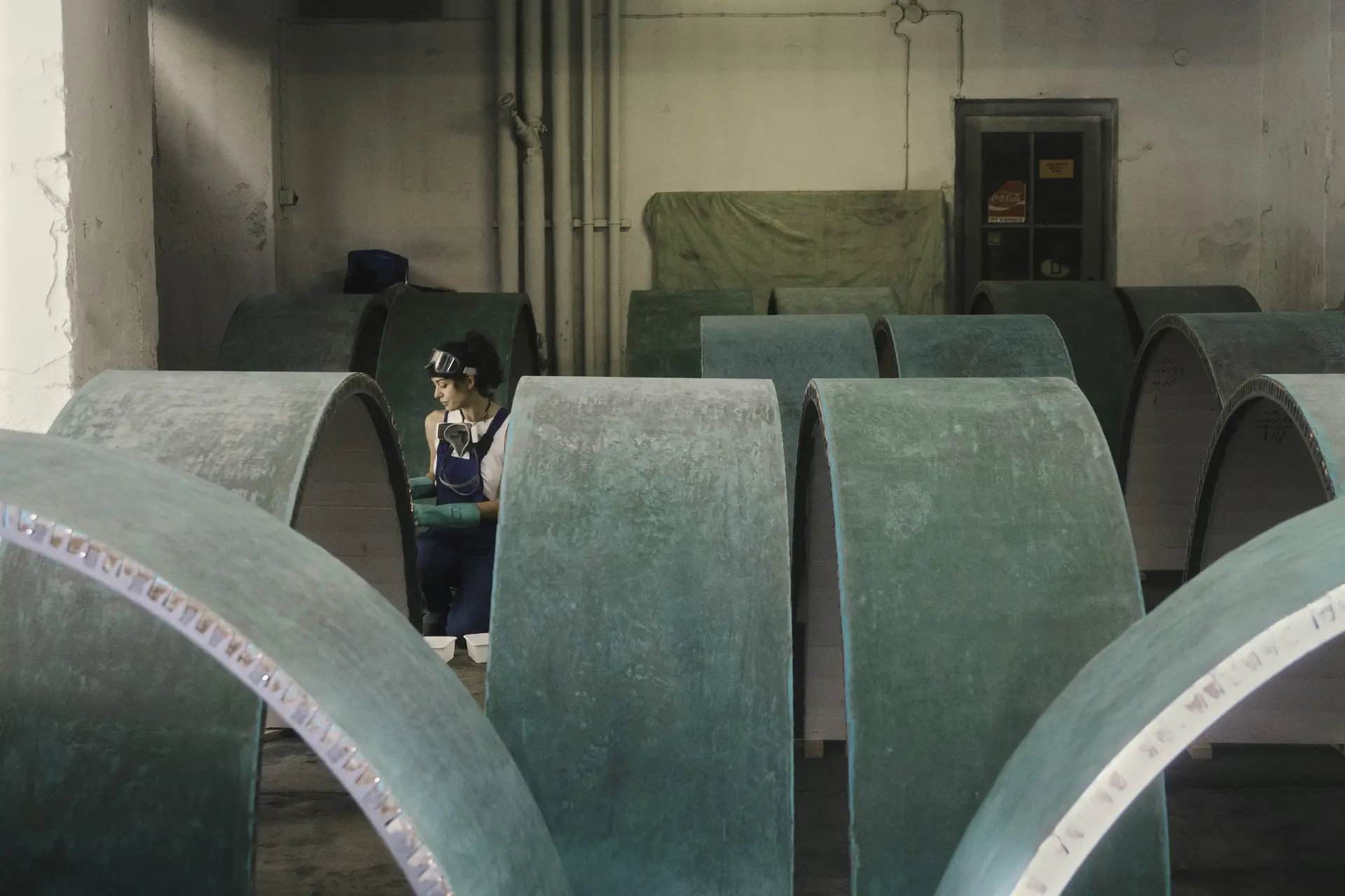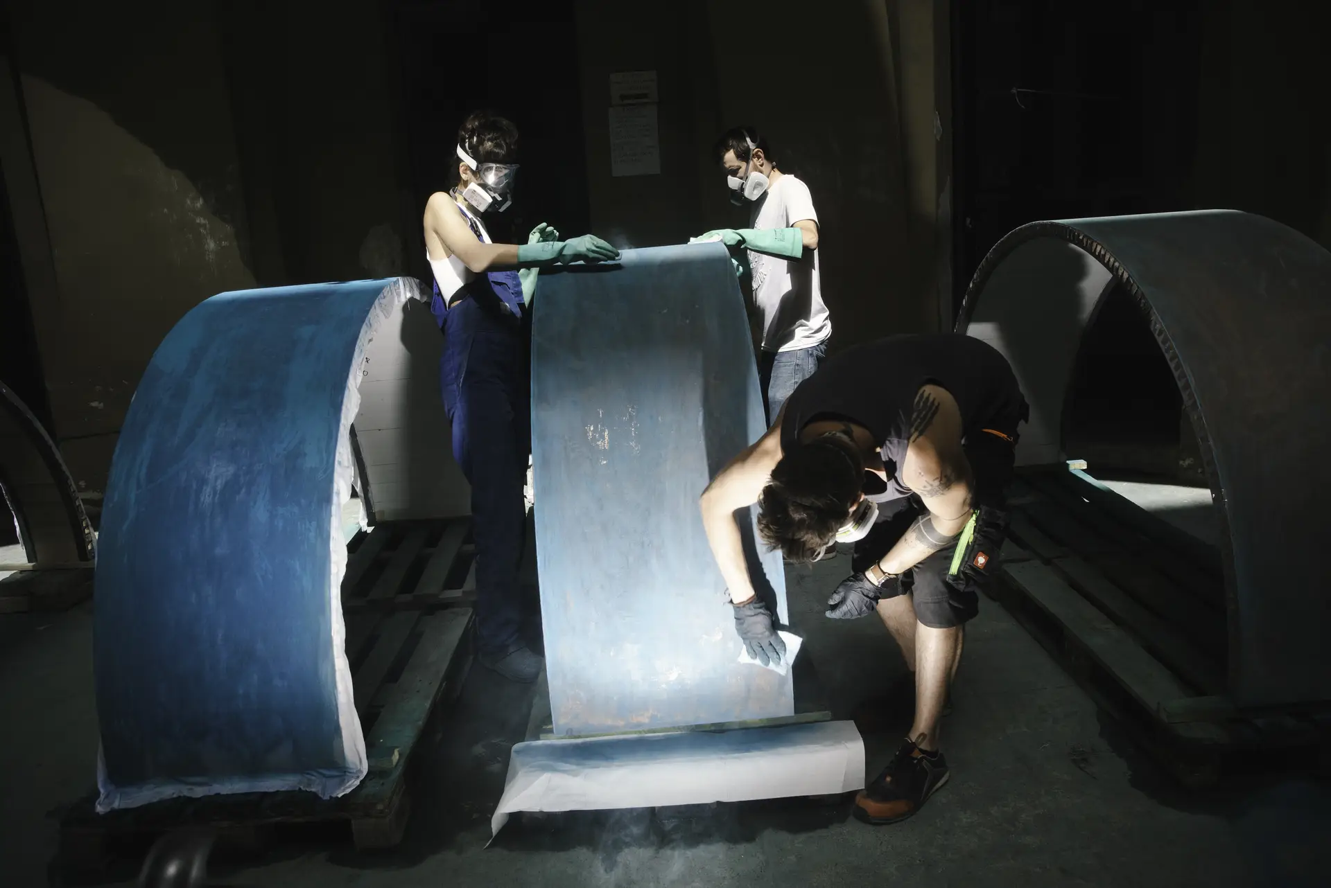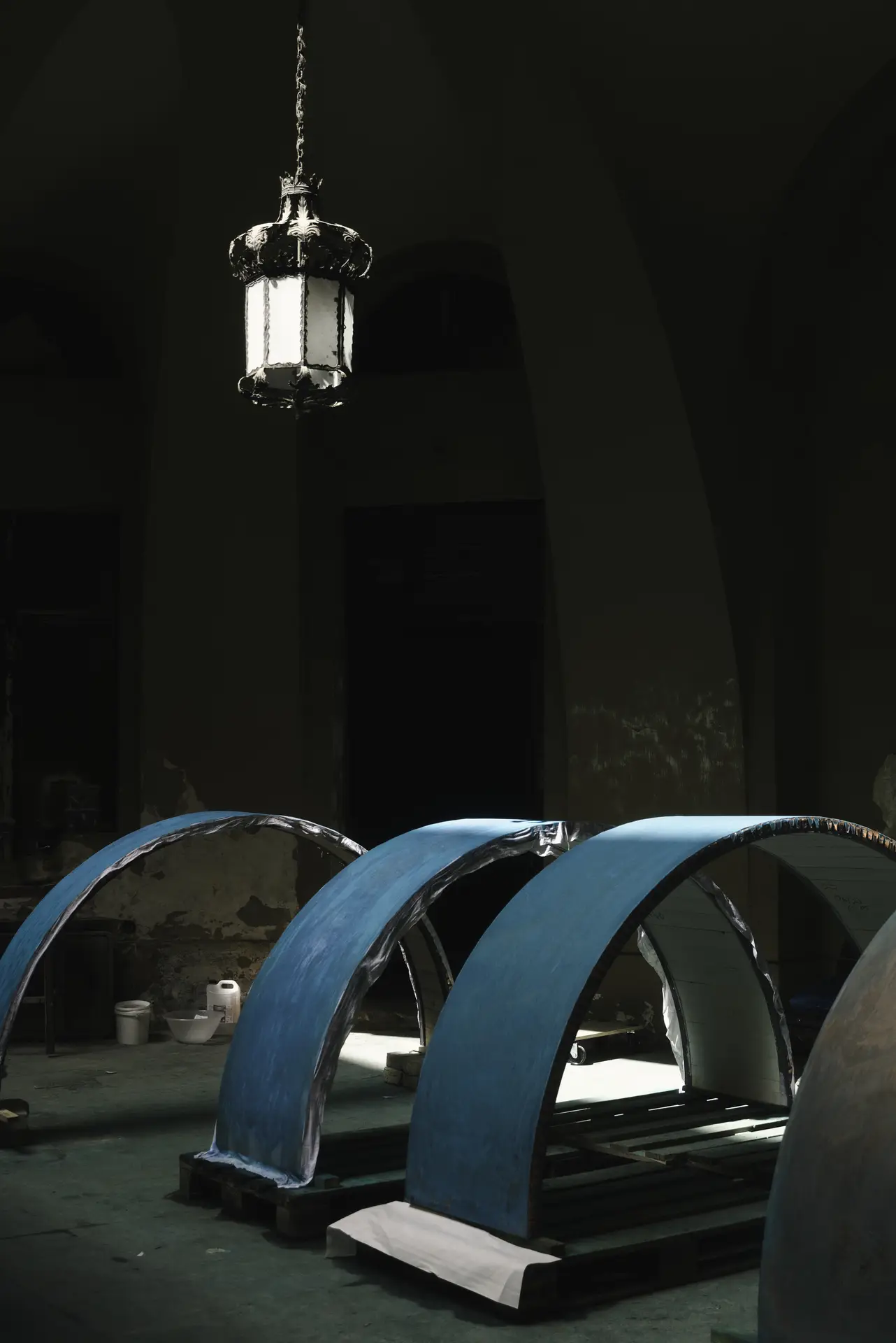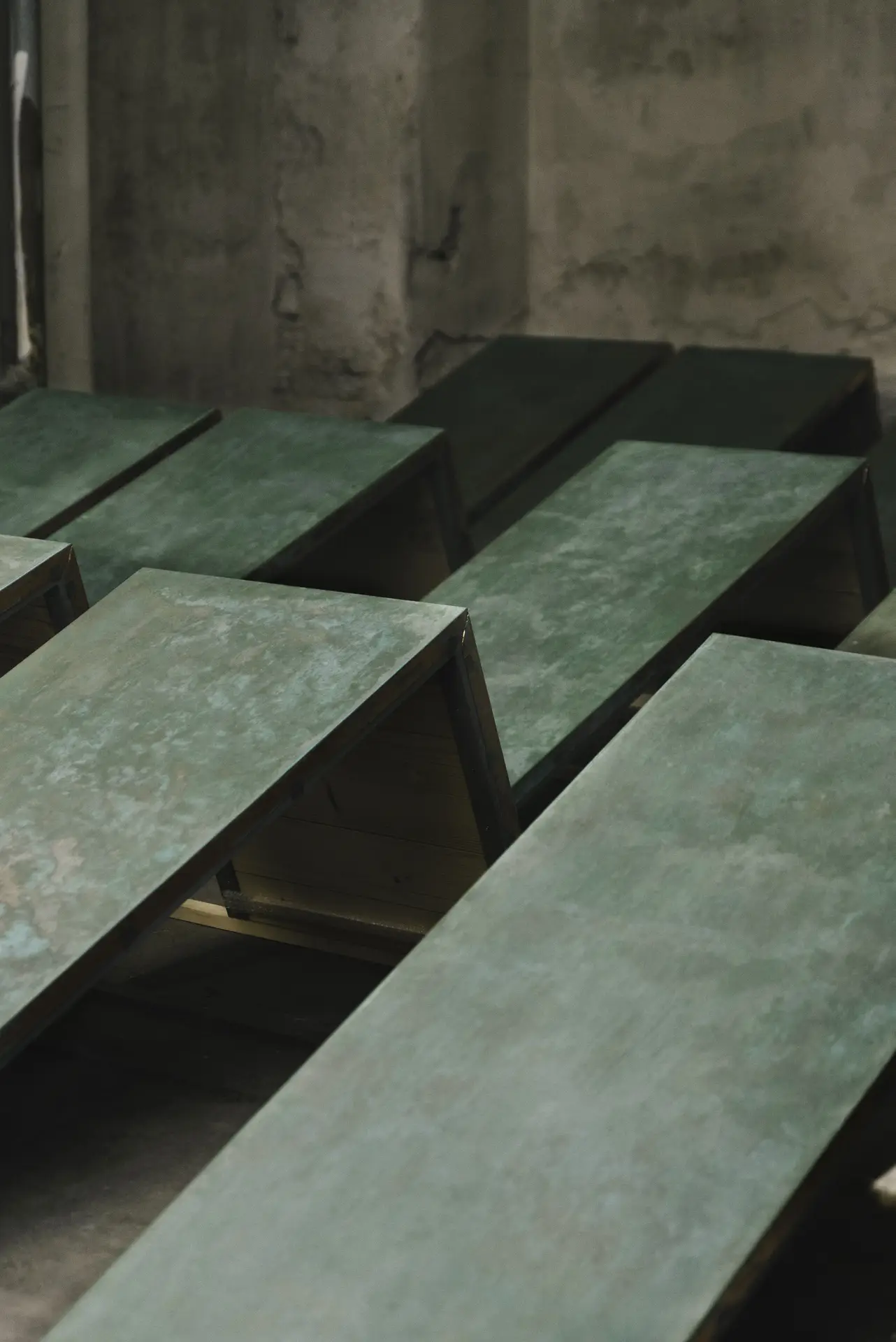 DescriptionAs part of a revitalization program, four palaces in central Budapest have been renovated. During the restoration of these partially heritage-listed buildings, the primary goal was to preserve as much of the original architectural structure as possible. At the same time, increasing the usable floor area was also an essential aspect, enabling the buildings to accommodate new functions. As part of the renovation process, a contemporary artist was invited to contribute to each building, creating a site-specific, significant artwork that reflects the character of the space. The patinated copper plates were created for the former Wagner Palace, where the central elevator was also renovated as part of its transformation into an office building. The elevator shaft is clad in 78 large copper plates, each hand-patinated to a green finish. Standing 15 meters tall, the elevator features a total surface area of over 100 square meters. Although the same process was used for each plate, every finish is unique, resulting in a delicately varied, organic surface.