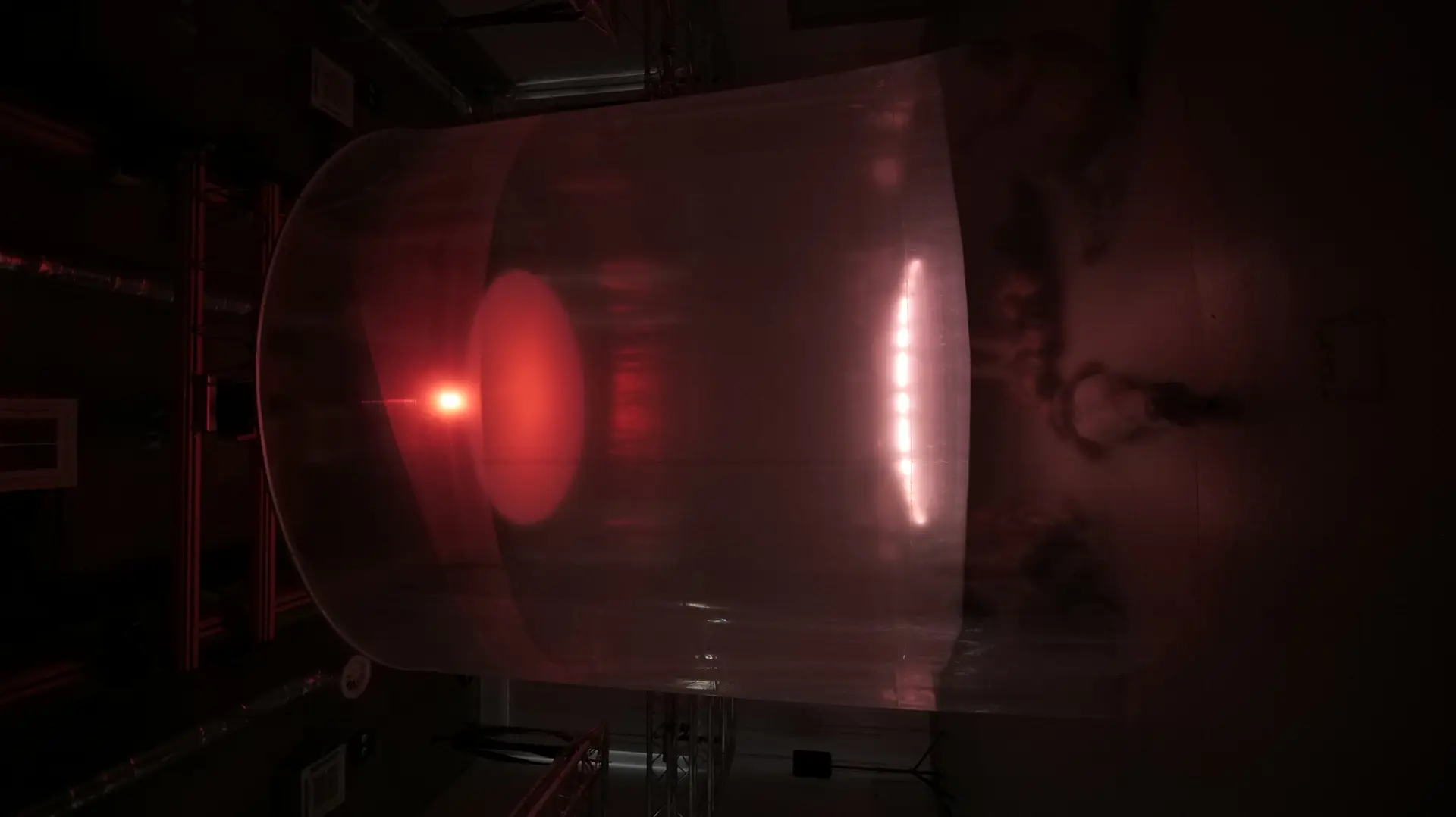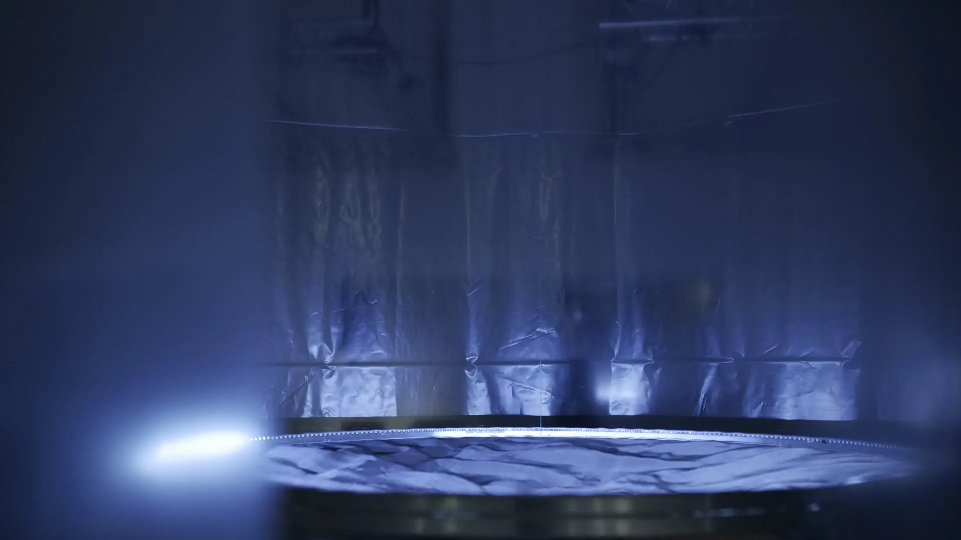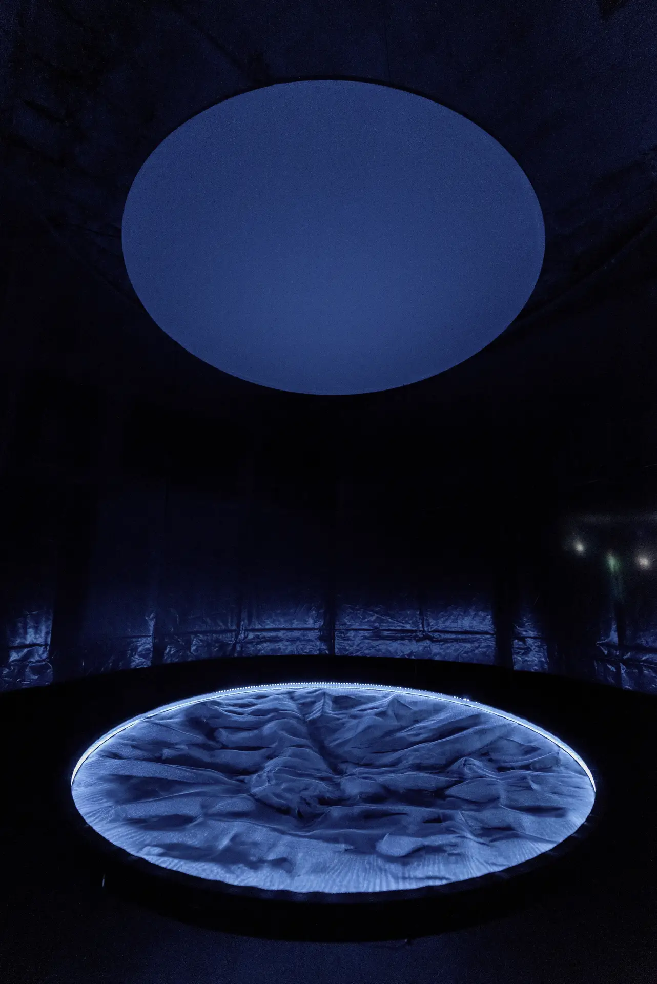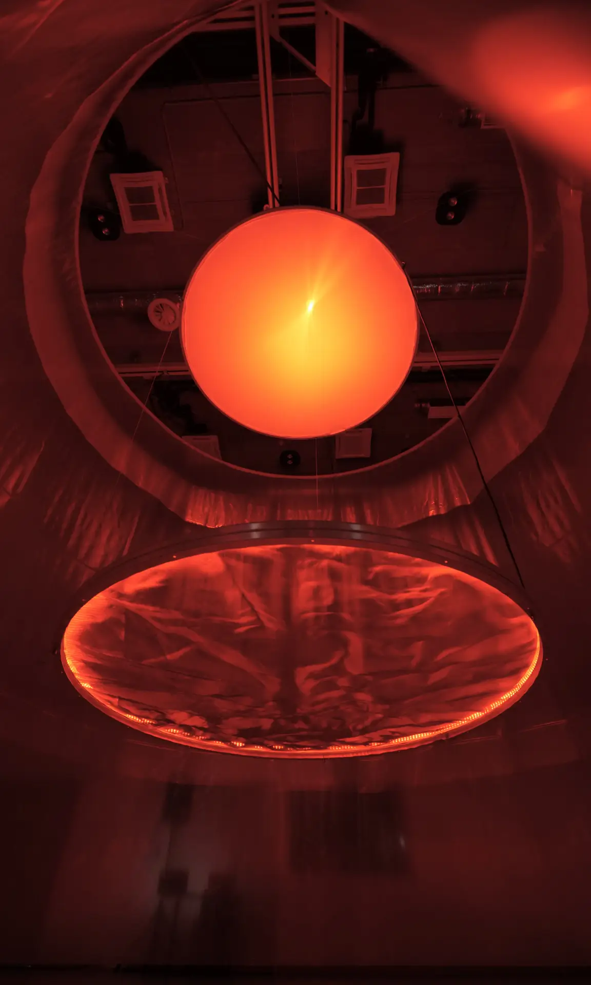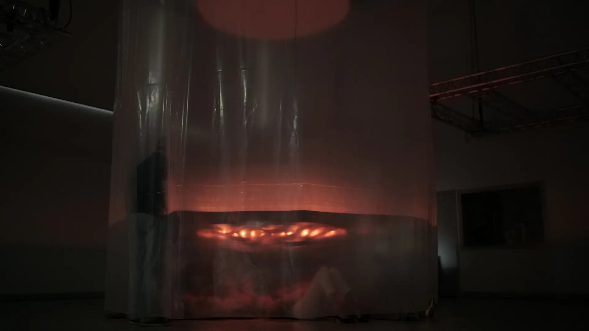 Radiance is inspired by the once-operating cooling towers of Inota. The installation highlights key elements of the cooling process while offering insight into a system where human presence was not allowed. Through the interplay of light, the work manipulates our perception of heat and symbolizes the journey of water used in the power plant's operation. The two arcs represent the cooling tower's top opening and water basin, while the translucent membrane contrasts with the concrete structure. In addition to visual elements, the cooling process is also represented through sound effects. The repetitive interplay of sound and light symbolizes the cyclical nature of the process.